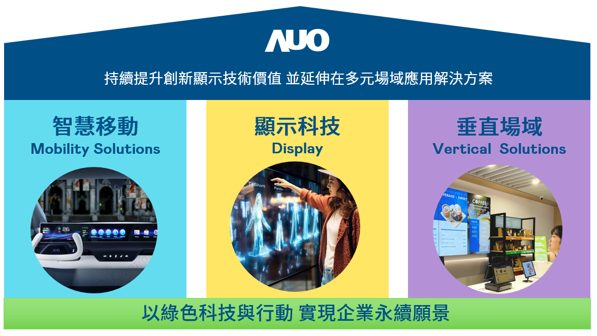 我們持續推動「雙軸轉型」,在精進顯示技術附加價值(Go Premium),與深化垂直市場應用(Go Vertical)的策略下,對應金年会官方网站入口的優勢競爭力與趨勢,我們奠定顯示技術、智慧移動、垂直場域三大永續營運支柱,在顯示技術領域的根基之上,延伸布局多元場域應用解決方案。將先進顯示科技助力智慧移動及垂直場域發展,並以綠色科技與行動為實踐,在轉型之路上貫徹永續經營之願景。